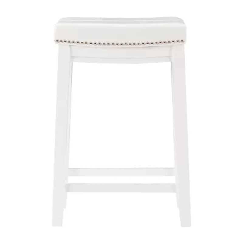 This bestselling counter stool helps to make any kitchen or parlor room welcoming to guests and family, no matter the occasion. A comfortable padded seat is upholstered with faux leather and fastened with double needle stitching for added durability. Shiny silver nail head trim lines the cushion, while white paint covers the solid wood frame to provide a regal aesthetic. The seat height of 26.5" is perfect for counter heights measuring 35h" to 39h".
