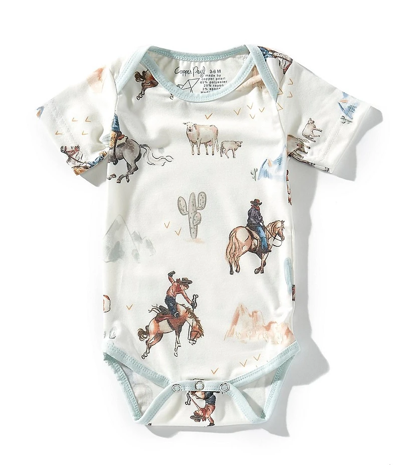 From Copper Pearl, this bodysuit features: Allover Western print Envelope neckline Short sleeves Snap crotch closure for easy diaper changes Polyester/rayon/spandex Machine wash/tumble dry Imported.