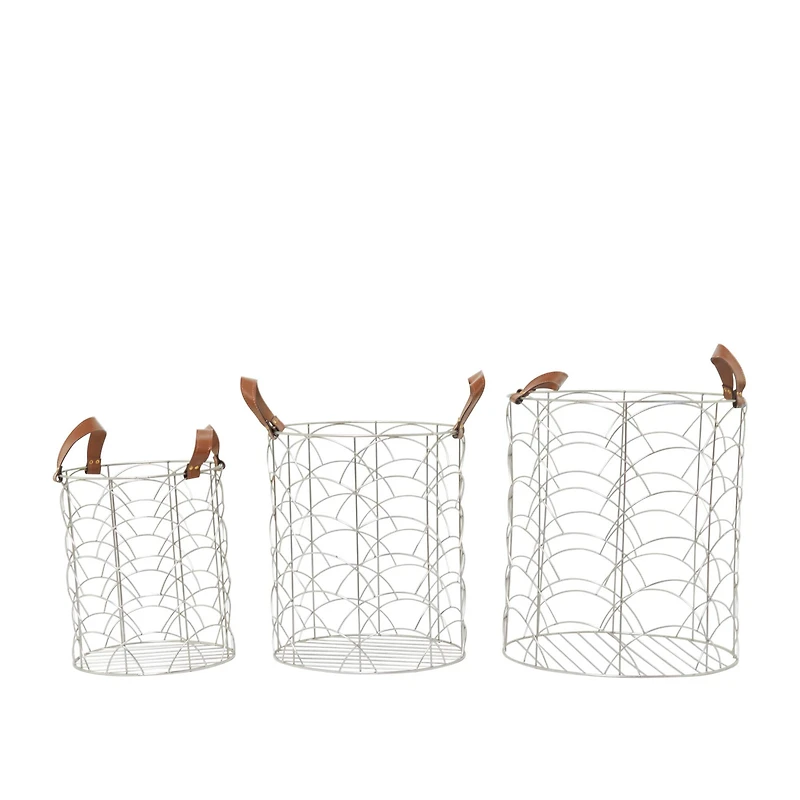 Elevate your space and add a touch of luxury with this glam inspired piece. Iron and leather give these baskets solid and durable forms. Metallic silver and natural brown leather finish highlights this set of 3 baskets. Leather handles are riveted on the sides of each metal basket for convenient hold and carry. Items measure 14"D x 16"H, 12"D x 14"H, 10"D x 12"H and collectively weigh 6 lbs Maintain a tidy home with a welcoming look with the help of these chic storage baskets. Organizing isn't boring when you have amazing storage baskets to fill. Store your belongings or laundry with these storage baskets that adds a hint of glam in your bathroom, bedroom, or living room space. This item ships in 1 carton. Suitable for indoor use only. Leather and hair on hide are natural products, and therefore no two will be alike. There may slight variations in pattern, natural blemishes, colors, and overall aesthetic of the product. Made in India. Set of 3 metal baskets. Glam style.