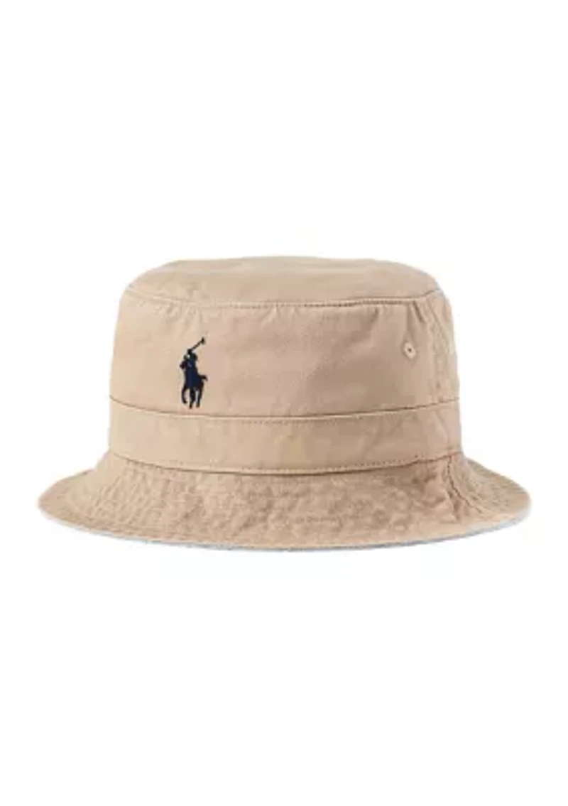Ralph Lauren’s signature embroidered Pony accents the front of this cotton chino bucket hat. Sweatband at the interior Ralph Lauren's signature Pony and "Polo" embroidered at the front Imported Product Specifications 1 in band around the crown Size S/M: 22.75 in inner circumference; Size L/XL: 24 in inner circumference Material & Care Cotton Wipe clean