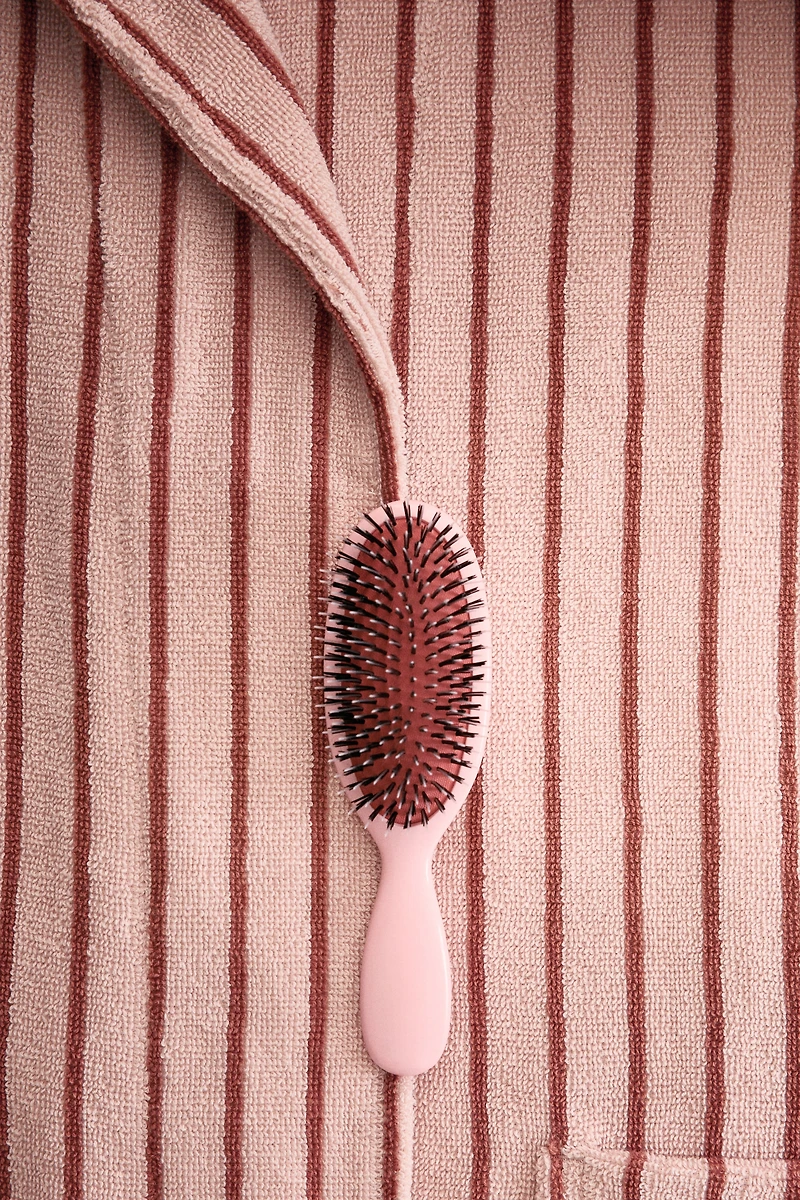 Striped bathrobe in soft cotton terry. Shawl collar, front pockets, and a removable tie belt at waist. 400 GSM.