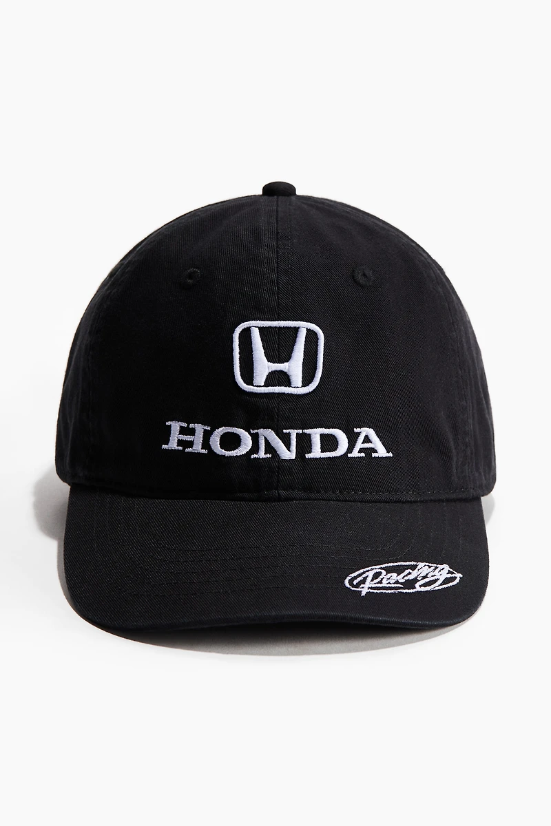 Cap in cotton twill with an embroidered motif detail at front. Embroidered eyelets, an adjustable tab at back with metal fastener, and a cotton sweatband.