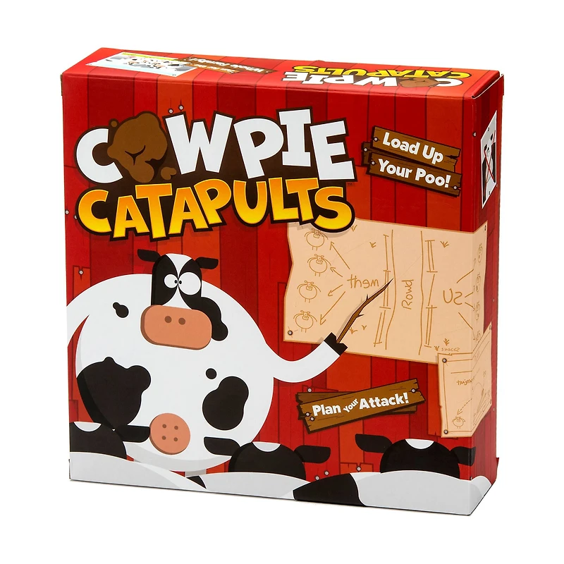 Load up your poo and plan your attack with Cow Pie Catapults, the poo flippin', cow tippin' battle of the barnyard! Arrange your cows on your side of the barnyard, load up the catapults, and let the fun begin! On 3-2-1, poo is launched through the air and lands with splendid splats. The first player to knock over all of the opponent's cows is the winner! This barnyard battle is a 2 player game that is fun for the whole family.Contents include: 8 Battling Bovines, 2 Awesome Catapults, 1 Big Barnyard Game Board, 14 Rubbery Cow Poo PiesFor 2 playersAges 6 and upMade in ChinaBrand new condition in original packagingWipe clean with dry or damp clothWarning: Choking Hazard - Contains small parts not suitable for children under 3 years.