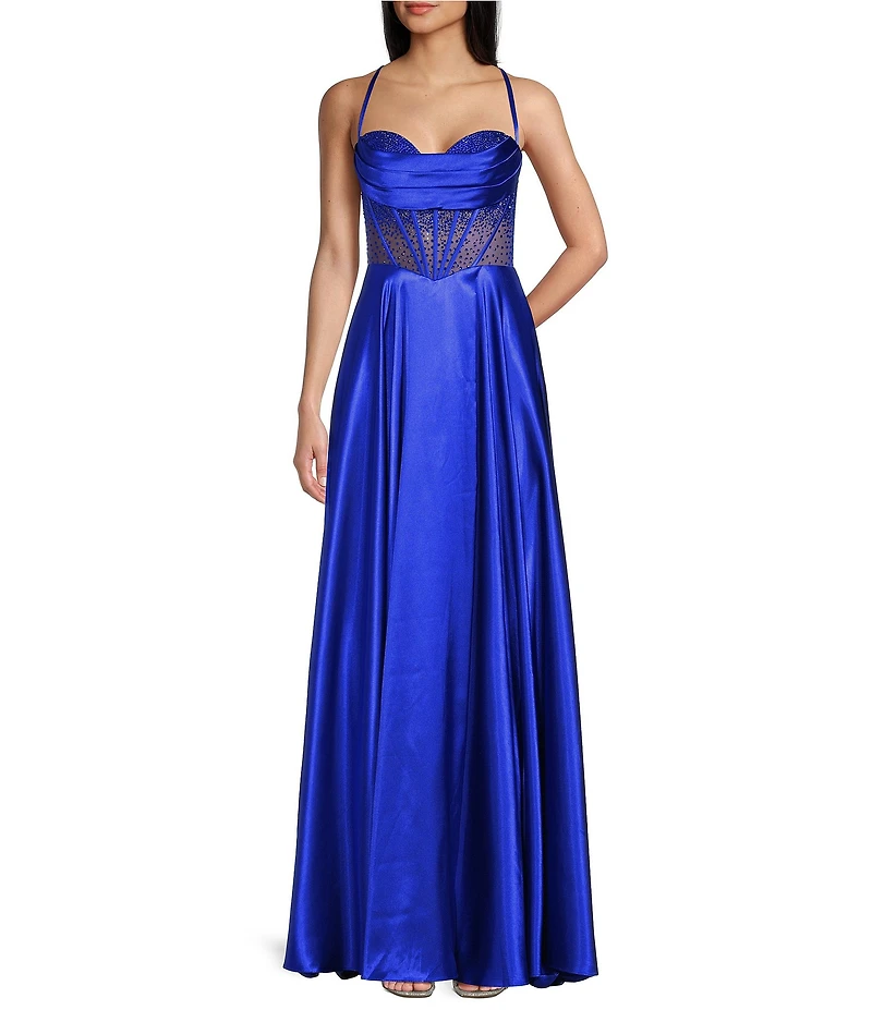 From Coya Collection, this dress features: Satin and mesh fabrication Sweetheart neckline Sleeveless Spaghetti straps Illusion corset with beaded stones Front slit A-line Lace-up zip-back closure Approx. 47" length Polyester Spot clean Imported.