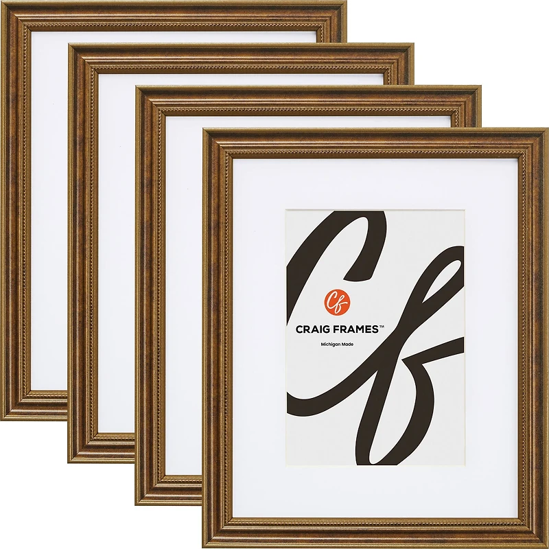 Step into a world of timeless charm with our exquisite Queen Anne-style matted picture frame, a perfect blend of vintage allure and craftsmanship. The Craig Frames Stratton Bronze Picture Frame is built from solid poplar wood and features a slender curved profile with delicate beaded detailing. This 0.75" molding is ideal for showcasing photos, posters, or prints. Ornate bronze beading and subtle tarnished undertones set this frame apart. Each element harmoniously converges to capture the essence of the Victorian era. Picture your favorite moments framed in the allure of yesteryears, casting a warm, nostalgic glow on your antique décor. The Queen Anne style adds character and depth, transforming your space with refined taste and classic beauty.Details:Victorian style, decorative bronze beaded detailingAvailable in multiple sizesFrame molding is 0.75" wideFrames smaller than 12" x 18" include: glass, rigid black backing and pre-attached stamped hanging hardwareFrames 12" x 18" and larger include: clear acrylic facing, rigid cardboard backing and hanging hardware kit (some assembly required)Frame is designed for wall hanging only (hardware allows for portrait or landscape orientation)Solid wood constructionSizes:5" x 7" unmatted, 4" x 6" matted8" x 10" unmatted, 5" x 7" matted8" x 12" unmatted, 5" x 7" matted8.5" x 11" unmatted, 6" x 9" matted10" x 12" unmatted, 8" x 10" matted10" x 13" unmatted, 7" x 10" matted11" x 14" unmatted, 8" x 10" matted11" x 17" unmatted, 8" x 12" matted12" x 12" unmatted, 9" x 9" matted12" x 15" unmatted, 8.5" x 11" matted12" x 16" unmatted, 8" x 12" matted12" x 18" unmatted, 10" x 13" matted13" x 15" unmatted, 9" x 12" matted13" x 19" unmatted, 9" x 13" matted14" x 18" unmatted, 12" x 16" matted14" x 20" unmatted, 11" x 17" matted14" x 22" unmatted, 11" x 17" matted16" x 16" unmatted, 12" x 12" matted16" x 20" unmatted, 11" x 14" matted16" x 22" unmatted, 12" x 18" matted16" x 24" unmatted, 12" x 18" matted17" x 22" unmatted, 13" x 19" matted18" x 24" unmatted, 12" x 18" matted19" x 25" unmatted, 14" x 20" matted20" x 20" unmatted, 16" x 16" matted20" x 24" unmatted, 16" x 20" matted20" x 26" unmatted, 16" x 22" matted20" x 27" unmatted, 16" x 24" matted20" x 30" unmatted, 16" x 24" matted22" x 28" unmatted, 18" x 24" matted24" x 24" unmatted, 20" x 20" matted24" x 30" unmatted, 20" x 26" matted24" x 32" unmatted, 20" x 28" matted24" x 36" unmatted, 20" x 30" matted26" x 32" unmatted, 22" x 28" matted