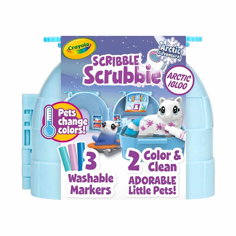 - CRAYOLA SCRIBBLE SCRUBBIE ARCTIC PETS IGLOO: Includes 1 plastic Igloo environment doubling as a storage case with foldable handles, 2 new color change pets, 3 markers, 1 brush, 1 sled, and 1 plastic tub.