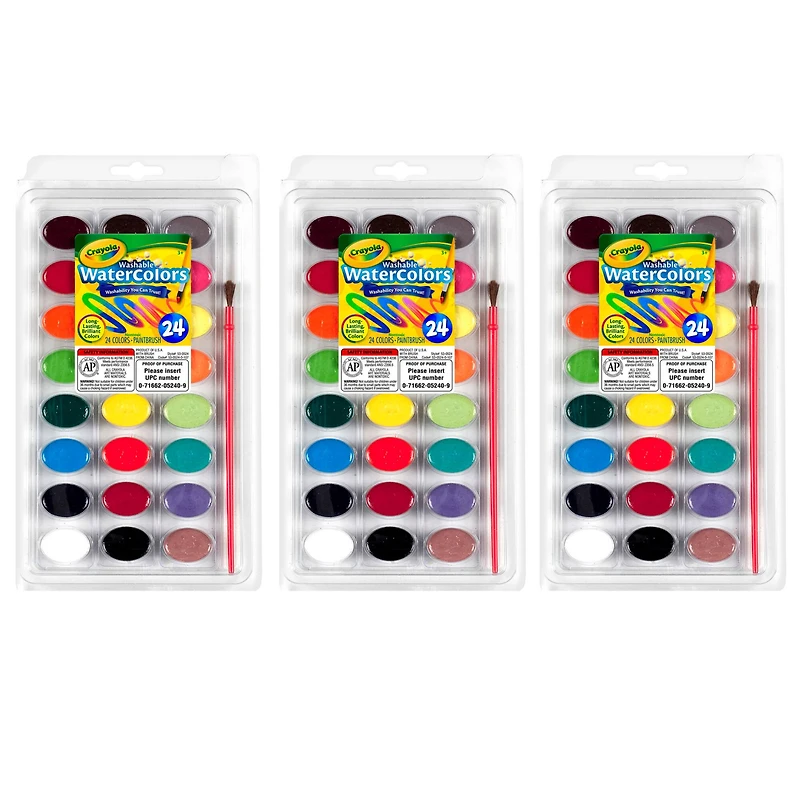 Crayola® Washable 24 Color Watercolor Pans with Plastic Handled Brush, 3ct.
