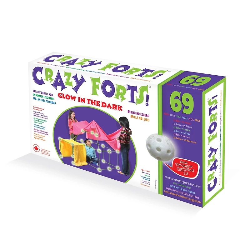Crazy Forts Glow in the Dark are a unique, award winning, building and creative toy. Crazy Forts come with 69 child-safe toggles and rods that join together to build any play space from your child's imagination. Create a "Cave" one day, an "Igloo", "Pirate Ship" or "Castle" the next... put the pieces together in different configurations, cover with bed sheets and "voila!" kids have a unique new play space every time! Crazy Fort is powered by a child's imagination. Each Crazy Fort Kit contains 25 geometrically precise balls and 44 sticks that connect to create a multitude of possible play structures. This kit comes with green rods and glow in the dark balls that glow for hours!Details:Glow-in-the-dark16.75" x 10" x 3.25" package sizeContents include: 25 balls, 44 sticksFor 1 or more playersMade in CanadaBrand new condition in original packagingWipe clean with dry or damp clothFor ages 5 and up