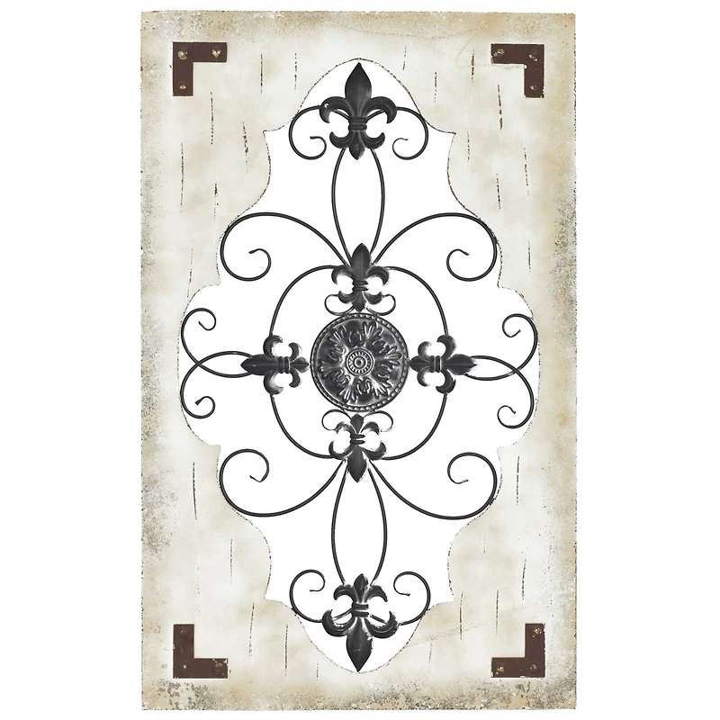 Add French charm and rustic texture to your walls with this rectangle wood wall décor panel with metal scrollwork of fleur de lis designs and scrolling vines. The black wrought iron adds rustic texture while ornate designs create movement and dimension against an empty wall.Details:Cream and brown26" x 42"Wood and metalHangs vertically via saw tooth hardwareFor indoor use only