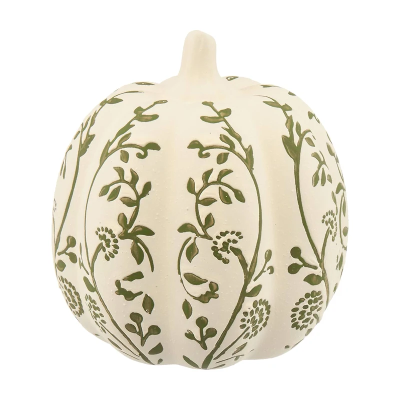 Add a touch of elegance to your autumn decor with our Cream Floral Pumpkin, standing at a charming 6 inches tall. This beautifully crafted pumpkin is a sophisticated take on traditional fall decorations, featuring an intricate floral design that brings a fresh and stylish look to any space. The pumpkin's soft cream color serves as the perfect canvas for the delicate green floral pattern that wraps around its surface. The detailed vines and blossoms are meticulously painted, providing a refined, botanical aesthetic that complements a variety of decor styles, from rustic farmhouse to modern chic. Made from high-quality, durable materials, this decorative pumpkin is designed to last through the season and beyond. Its sturdy construction ensures it can be displayed year after year, making it a timeless addition to your seasonal decorations. Perfect for placing on mantels, tabletops, or as part of a centerpiece, the Cream Floral Pumpkin effortlessly enhances your home with a touch of autumnal grace. Pair it with other fall-themed decor or let it stand alone as a stunning accent piece. Celebrate the beauty of the season with this elegant Cream Floral Pumpkin from pOpshelf. It's an ideal choice for anyone looking to elevate their fall decor with a blend of classic and contemporary design.