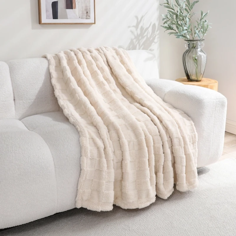 Cream Zane Faux Fur Checkered Throw