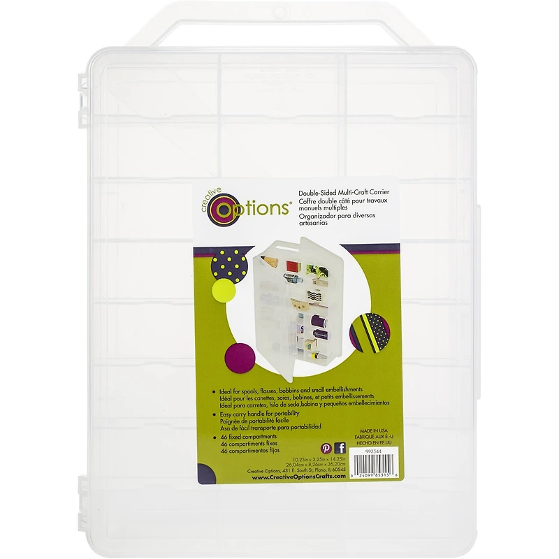 Perfect for storing spools, flosses, bobbins and small embellishments. The organizer has two hinged doors so access is easy from either side and also features 46 fixed compartments, a carry handle for portability, and is made of transparent, durable molded plastic. This package contains one thread organizer. Made in USA.Details:Clear10.25" x 3.25" x 14.25"Features 46 fixed compartmentsCarry handle for portabilityPlastic
