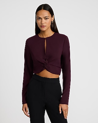 Crafted from luxe crepe fabric, this long sleeve top features a twist front with a keyhole detail and a crew neckline. It is cut in a modern cropped length for trendy outfitting.