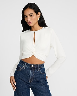 Crafted from luxe crepe fabric, this long sleeve top features a twist front with a keyhole detail and a crew neckline. It is cut in a modern cropped length for trendy outfitting.