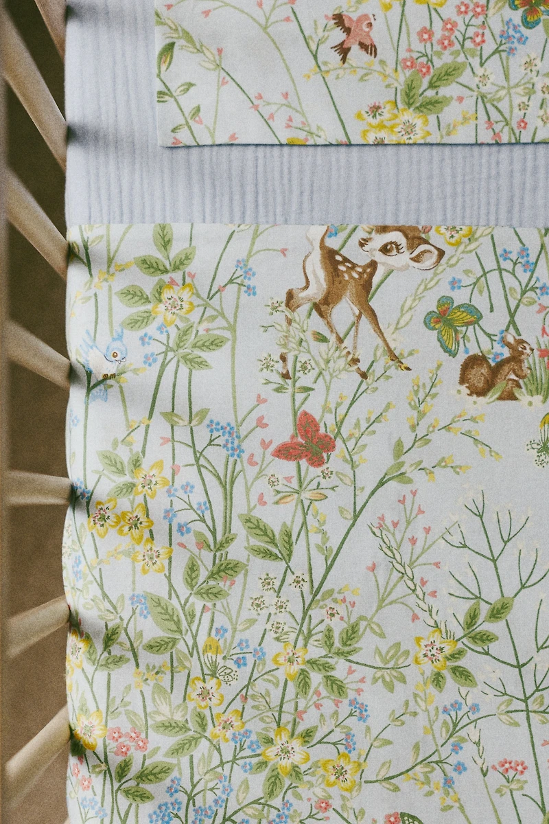 DISNEYxSANDERSON H&MHOME. Crib bedding set with a duvet cover and pillowcase, both in soft, woven cotton with a printed pattern. Opening at foot end for easy changing. Pillowcase with a classic envelope opening. Take a nostalgic wander through childhood memories and explore the magical world of Disney. Fall in love with the sweet, familiar characters through the whimsical prints of renowned British wallpaper and fabric brand Sanderson.