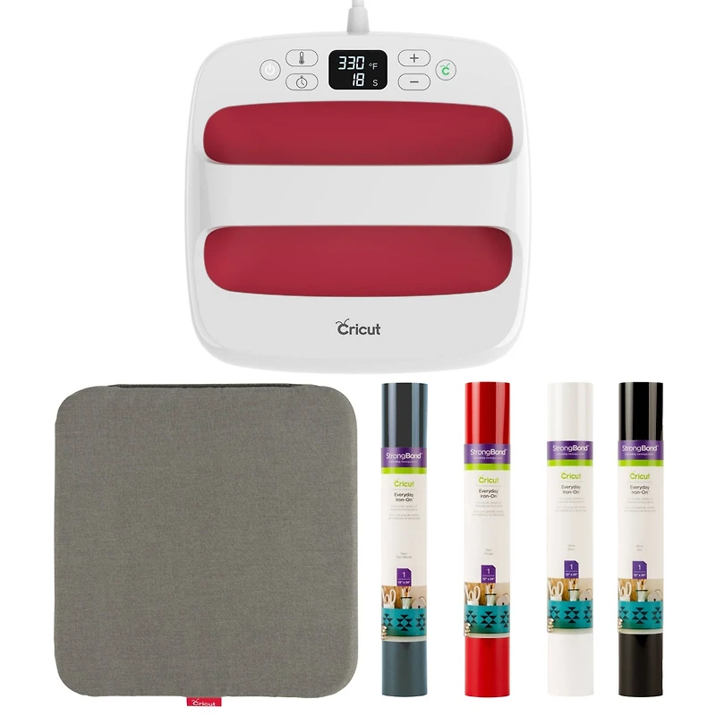 Create heat transfers that wow with this kit. Cricut EasyPress 2 combines the speed of a heat press with the convenience of an iron. Includes the press, plus must-have materials for making custom t-shirts, totes, decor, and more. The online Cricut Heat Guide offers precise time and temperature settings for every project. This kit is the perfect companion to any Cricut® cutting machine.Details:Professional heat-transfer results without the guessworkAdvanced heat plate design with ceramic-coated surfaceCompatible with all Infusible Ink® products and most major brands of iron-on materialPrecise temperature control up to 400°F (205°C)Easy to learn, simple to useInsulated Safety Base and auto-shutoff featureLightweight, portable, easy to storeA perfect complement to Cricut® smart cutting machinesContents:Cricut EasyPress 2 heat press, 9" x 9" in Raspberry1 Cricut EasyPress Mat1 Everyday Iron-On roll in White (12" x 24"/30.5cm x 61cm)1 Everyday Iron-On roll in Navy (12" x 24"/30.5cm x 61cm)1 Everyday Iron-On roll in Red (12" x 24"/30.5cm x 61cm)1 Everyday Iron-On roll in Black (12" x 24"/30.5cm x 61cm)WARNING: Requires maximum input 120V outlet. Not recommended for use outside North America.