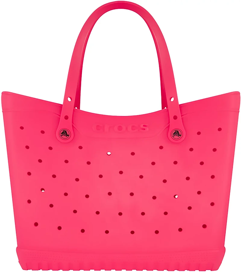 Carry all of your essentials in the Crocs Large EVA Tote Bag. Its 100% EVA construction is extremely durable. The main compartment fits up to 5 beach towels, throw blankets, snacks, drinks, and toiletries, and its 11-inch EVA top handle strap helps carry the load. The tread on the base to keep it from slipping on wet surfaces.
