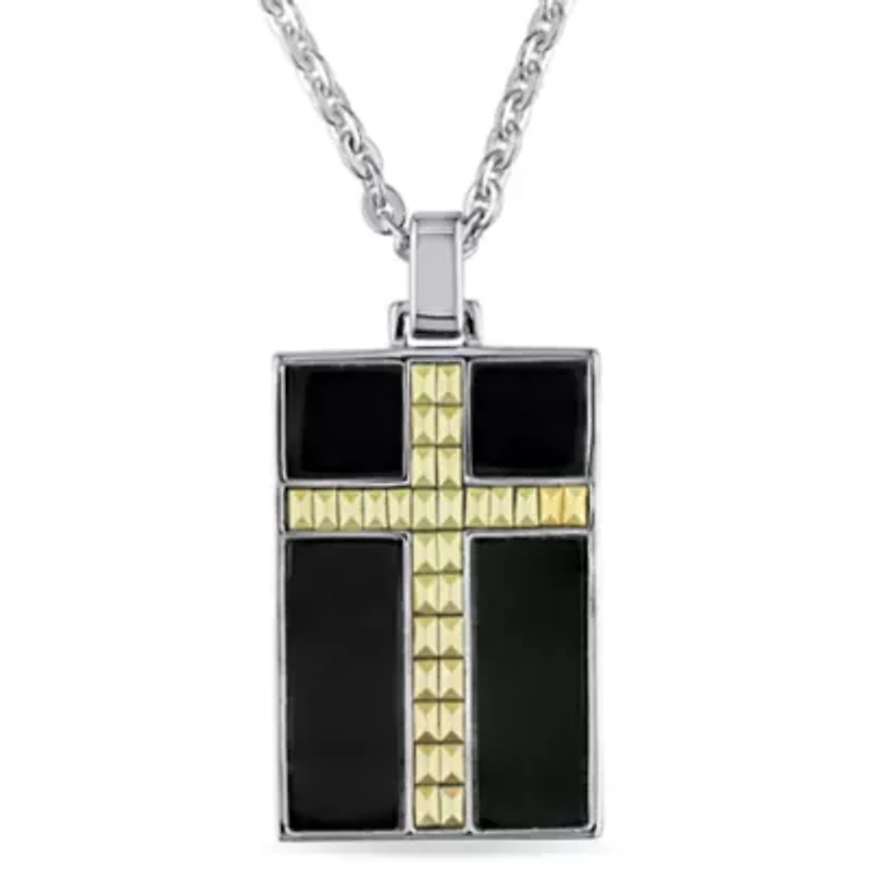 Make a meaningful statement with this two-tone sterling silver cross pendant, featuring subtle black enamel accents. The blend of yellow and white tones creates depth and visual interest, while the polished finish catches the light with a refined shimmer. Suspended from a delicate chain, it adds a touch of elegance to any outfit, whether worn alone or layered. Its thoughtful design balances symbolism with contemporary style, perfect for both everyday wear and special occasions. More than just a pendant, it embodies faith, sophistication, and timeless beauty. Lobster closure Polished finish Warranty available, 60 days Thailand Imported Product Specifications 20-mm width, 18" Material & Care Sterling Silver Metal, Sterling silver Clean with a soft cloth.