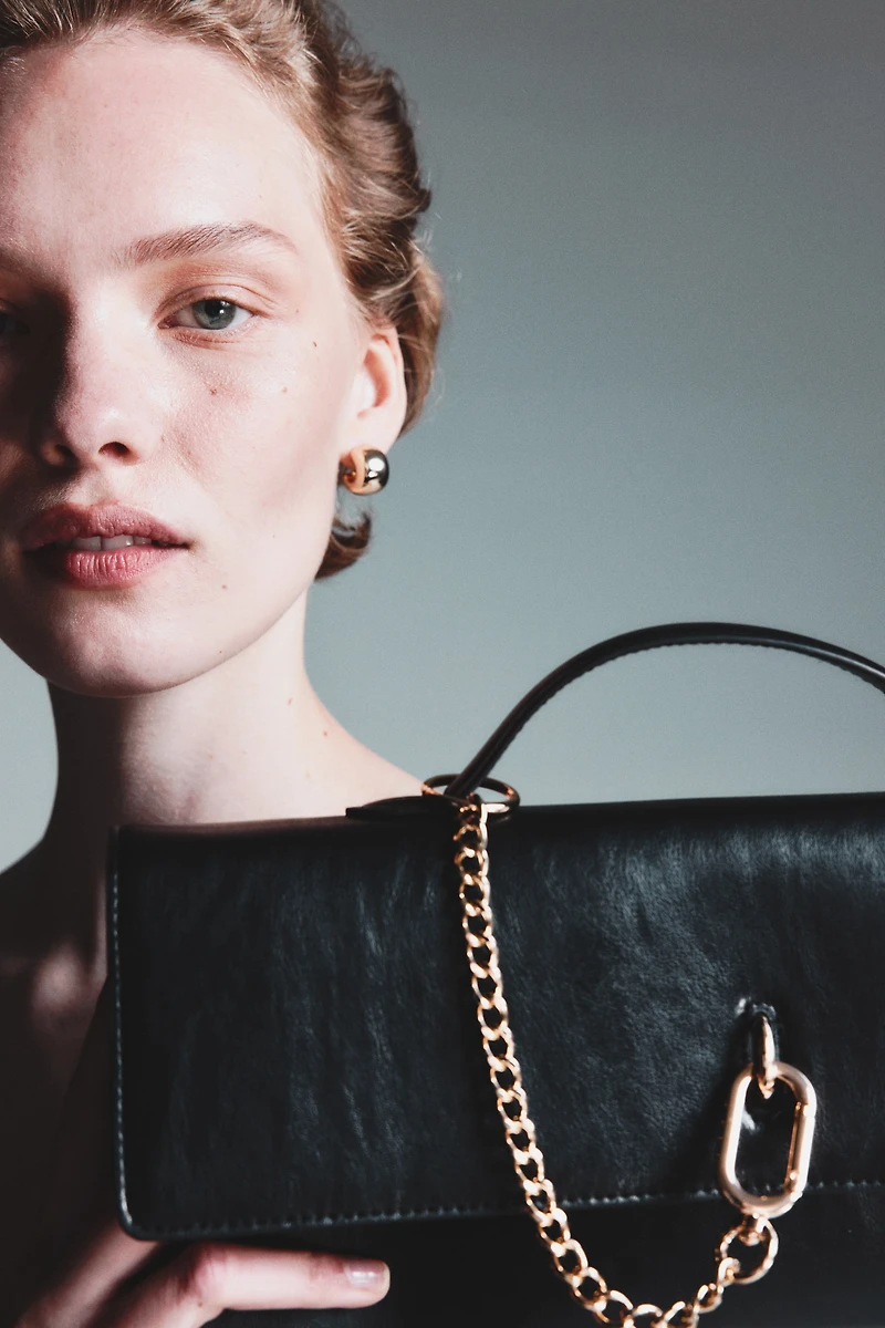 Rectangular crossbody bag. Adjustable shoulder strap, handle at top, and flap at front with an oval carabiner hook. A chain connects flap and handle.
