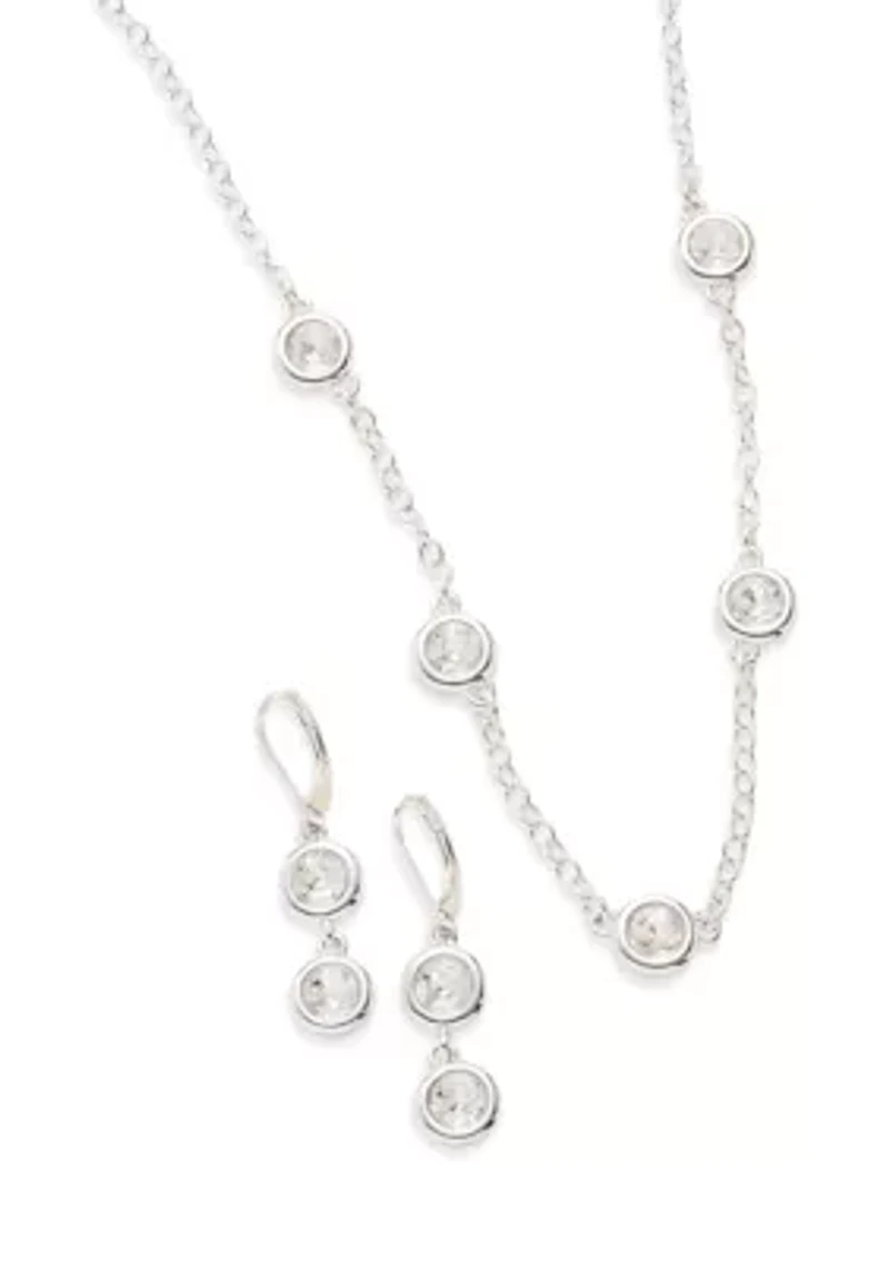 Elevate your look with this stunning two-piece jewelry set from Crown & Ivy™. The elegant frontal necklace and matching drop earrings, featuring sparkling crystal accents, create a captivating ensemble. Crafted from silver-tone metal, this set adds a touch of sophistication to any outfit. 2-piece set Earrings: lever back closure Necklace: lobster closure Imported Belk Exclusive Product Specifications Necklace: 16" L + 3" extender; Earrings: 1.75" drop L Material & Care Silver-tone metal Clean with a soft cloth