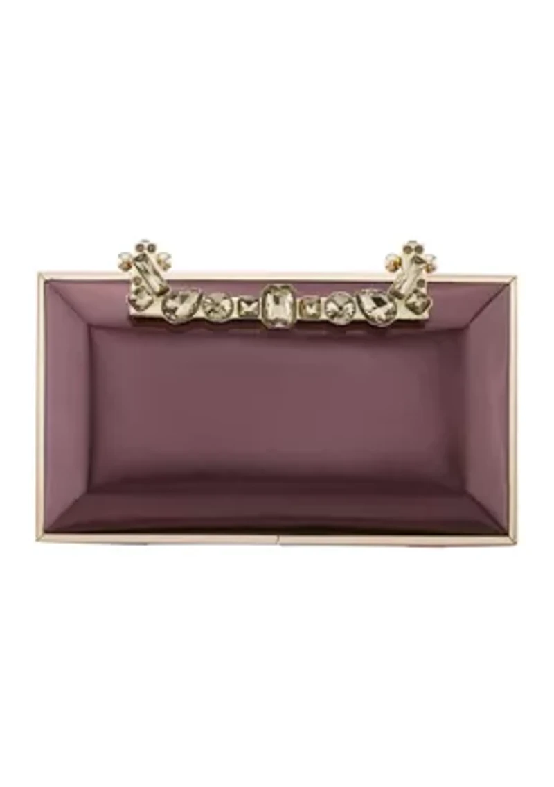 Elevate your evening look with this Nina minaudiere. Featuring a shimmering metallic finish and a crystal-adorned handle, this compact clutch combines style and sophistication. The lift-lock closure ensures security while adding a touch of glamour, making it perfect for weddings, parties and special occasions. Crystal handle with 1" drop Removable strap Interior: 1 slip pocket Imported Product Specifications 8" L x 4.5" H x 1.5" D Material & Care Polyurethane Spot clean only