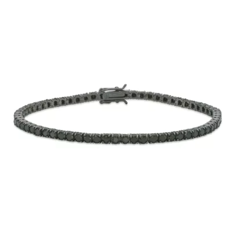 Elevate your elegance with our stunning 925 Sterling Silver and Black Rhodium Round Black Spinel Tennis Bracelet. This exquisite piece is not just an accessory; it's a statement of sophistication and grace. Imagine wearing a bracelet that not only complements your outfit but also resonates with the depths of your unique personality. Whether it’s a night out on the town or a refined dinner with friends, this tennis bracelet will add that perfect touch of luxury and allure to your ensemble, making you the center of attention. Crafted from genuine 925 sterling silver and adorned with a striking black rhodium finish, this 8-inch bracelet is designed for durability and timeless style. The dazzling 3 MM round black spinel black spinel shine beautifully against the rich black backdrop, offering a chic contrast that embraces modernity while honoring tradition. With a comfortable tongue clasp, this bracelet ensures a secure fit, providing you with peace of mind as you flaunt this stunning jewelry piece at any occasion. Perfect for gifting or as a personal treat, it seamlessly transitions from casual to formal wear. Box clasp, 65 Polished finish Prong setting Thailand Imported Product Specifications 8-in. x 3mm 6.5 Material & Care Metal, Sterling silver Use silver polishing cloth on silver items.