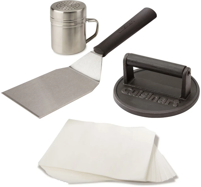 Cook the best burgers you have ever had using the Cuisinart Smashed Burger Kit. The cast iron press lets you create the perfectly-sized patty, and the burger flipper's sharp edge easily slides beneath the patties for precise flipping. The Patty Papers can be placed on the patties to prevent sticking, and the 1-centimeter raised edge on the press locks in juices and fats for a caramelized, flavorful taste.