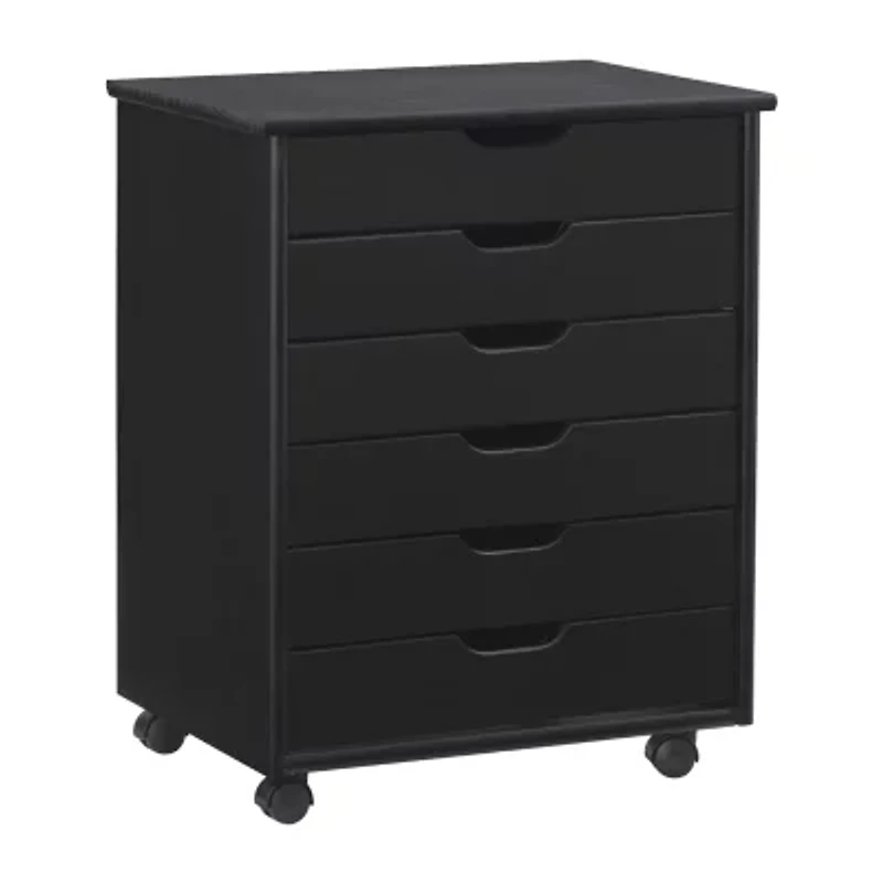 This Linon six drawer rolling storage cart is wide to provide extra drawer capacity in this versatile storage solution for office, kitchen, bedroom or anywhere where organization is needed. In a natural finish that will allow this mobile piece to blend into any decor. Six equal size, wide drawers and an ample top can go next to a desk or craft table to put items within reach. Soft contoured handle cut out is easy on the touch and creates a clean, modern look. Drawers can be easily removed and used as a tray to transport your items to your workspace. Casters make this piece mobile to go into any room easily.