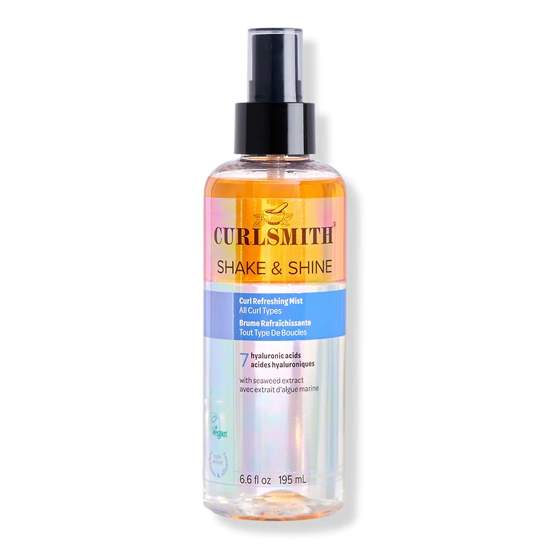 SHAKE & SHINE MIST 6.6OZ. Benefits: A curl refreshing mist to refresh, moisturize and define. Designed to refresh curls in between wash days.. Up to 41% increase in hydration*. Delivers long-lasting frizz control - for up to 24 hours*. Reduces frizz by up to 71%*. Contains 7 types of Hyaluronic Acids. Known to help maintain balanced hydration & enhance smoothness. *Based on third party testing vs control. Features: WHO IS IT FOR? All curl types & textures.. BEST FOR: Best for wavy and curly hair.. FORMAT: Light mist. RECOMMENDED FREQUENCY: Regular use. Color-Safe. Made without sulphates, silicones or drying alcohols. :