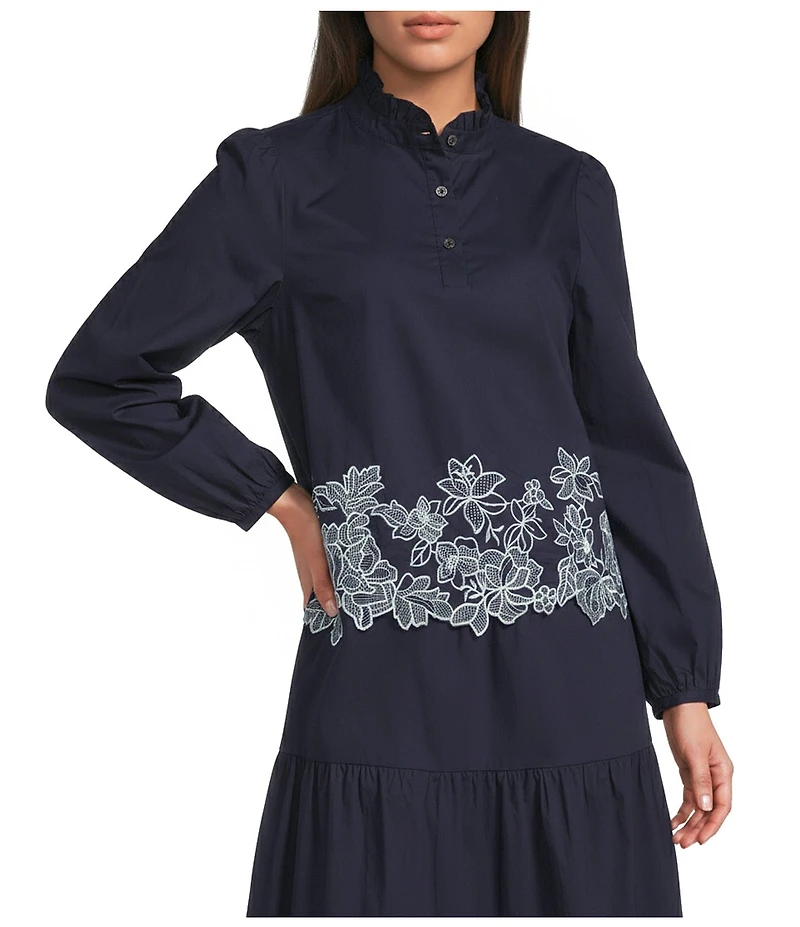 Current Air Coordinating Cotton Ruffle Stand Collar Long Sleeve Embroidered Scalloped Hem Blouse
