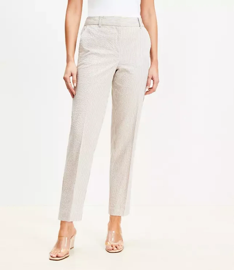 THE FEEL GOOD FIT: body - skimming, stretchy yet structured with a mid - rise, for a smooth and ultra - flattering feel. WHERE TO WEAR: our all - time favorite work - to wherever, go - all day pant., Pants Details: Front zip with hook and bar closure. Belt loops Slash pockets Back welt pockets., Leg Shape: Riviera Slim - fitted through the hip and thigh with a semi slim leg, Rise: Sits at natural waist, 10 1/2"rise, Imported:, Fit: A forever favorite that's new and improved - with a clean and classic fit perfect stretch, Length: Ankle length, 27"inseam, Fabrication: 98% Cotton 2 Elastane, Garment Care: Machine Washable Loft Curvy Riviera Slim Pants in Striped Seersucker Size 6 Natural Jute Women's by Loft Size Regular - 6 Natural Jute Women's Curvy, Slim Pants 98% Cotton 2% Elastane Machine Washable