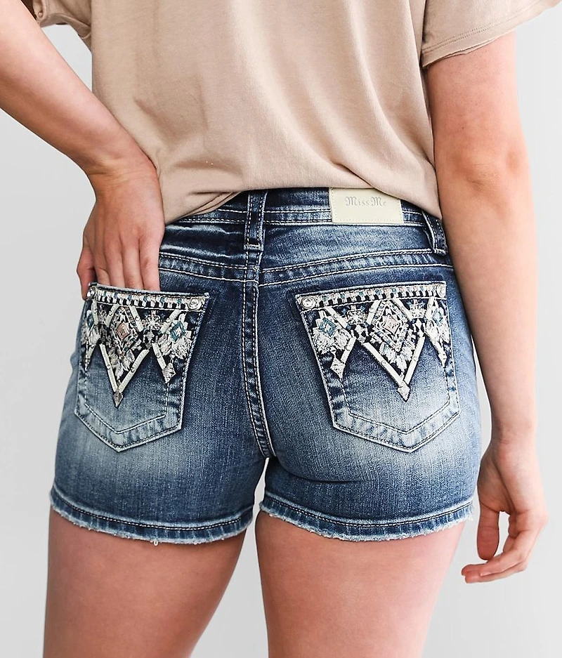 Mid-rise Curvy fit, eased through the hip and thigh 3" shortie short Comfort waistband Rhinestones on metallic and color pop stitch embroidered back pockets Destructed hem details Model Info: Height: 5'8" | Bust: 35" | Waist: 29" | Hip: 41" | Wearing Size: 26