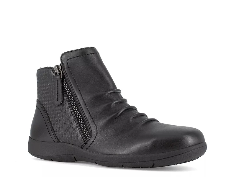 Turn heads at work with the Daisey Alloy Toe work bootie from Rockport Works. Ruched details and a patterned shaft make this zipper bootie fashionable. An electrical hazard protection keeps you shielded from live circuits and wires, while the ASTM F2413 maintains overall safety. A slip-resistant rubber outsole backed by ASTM F3445 approval prevents accidental trips.
