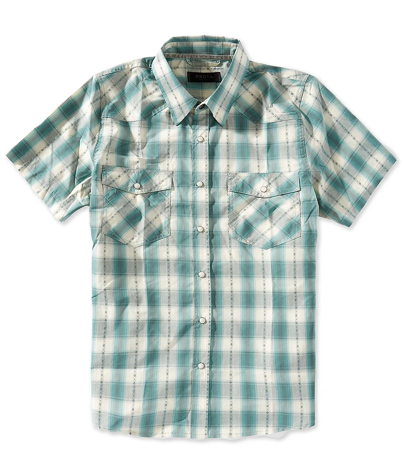 From Dakota Grizzly, this shirt features: Plaid pattern Hidden button-down collar Short sleeves Snap-front closure Dual chest snap-closure pockets Embroidered chevron back yoke Stretch dobby weave Cotton/polyester/spandex Machine wash/tumble dry Imported.