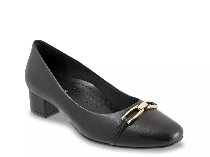 Add to your professional or formal collections with the Dakota pump from Trotters. The classic silhouette, crafted from leather, is sure to pair well with fave fits easily.