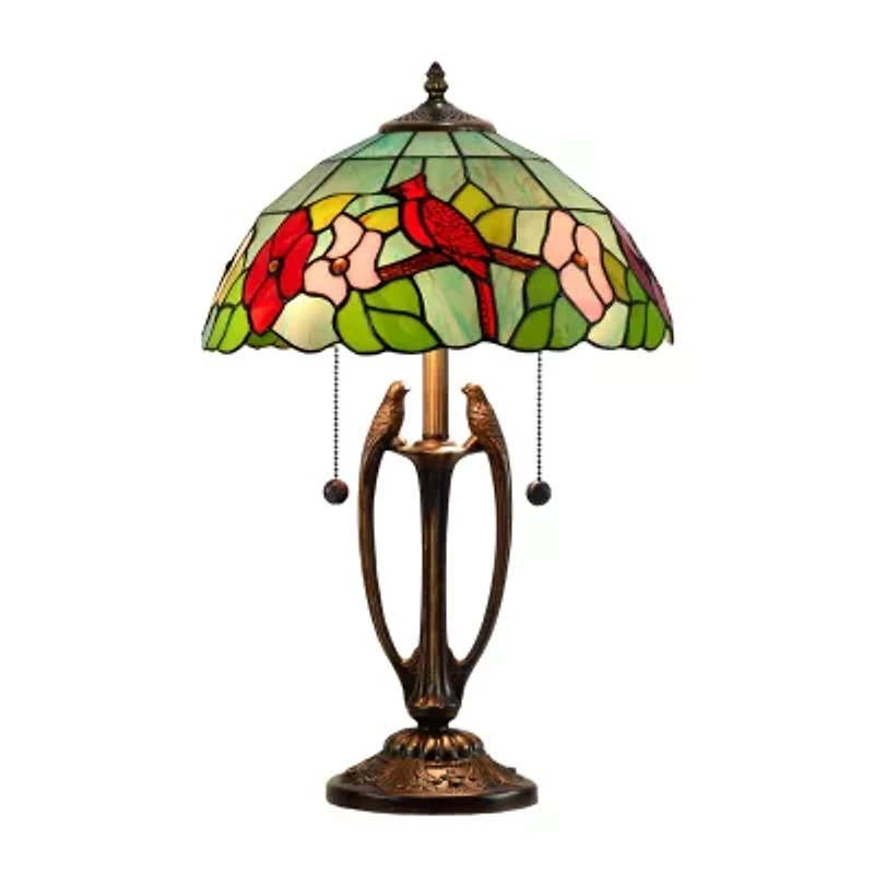 Pretty as a picture, our buttercup tiffany table lamp adds the ideal finishing touch to any decor in your home or office. The generously sized lamp features a large dome shade with a leafy green background that depicts a lush tree. A wide branch of pink, red and amber pansy blossoms, each dotted at its center with an art glass gem, runs around the circumference. Vibrant red cardinals with intricately detailed black filigree are perched at intervals that add to the realistic feel. The beautifully car base is finished in antique bronze and features a meticulously cast floral pedestal. Around the center column, a pair of beautifully cast birds with elongated tailfeathers create a split column effect. A perfect choice in a living room, den, bedroom or office, our buttercup tiffany table lamp also makes an ideal gift for an avian enthusiast or bird watcher.