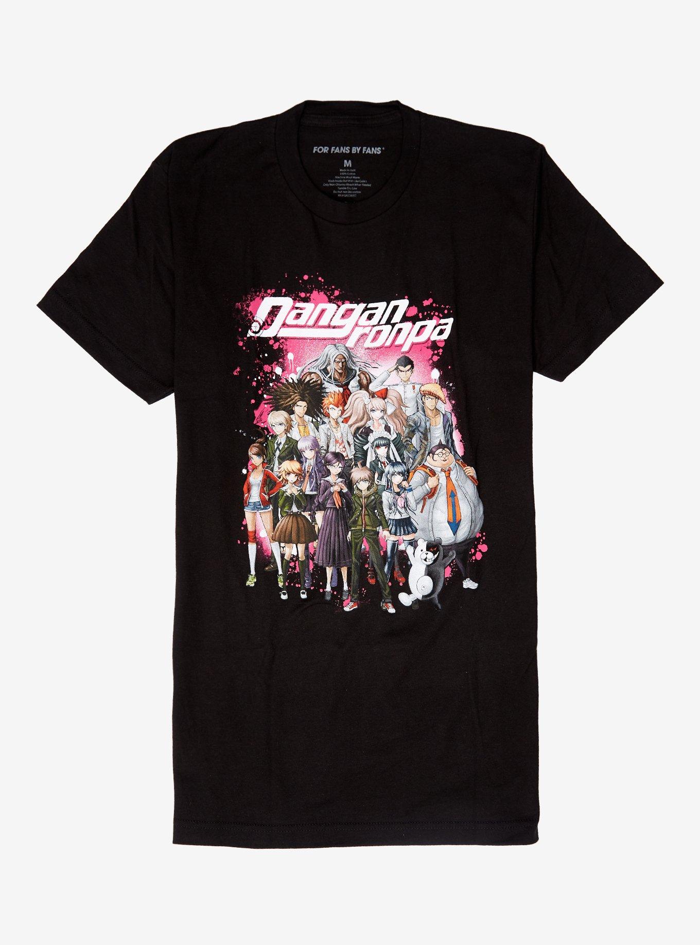 Can't pick a favorite from Danganronpa ? Just wear 'em all! This black tee is printed with all the students with a splatter pink background and the title above.