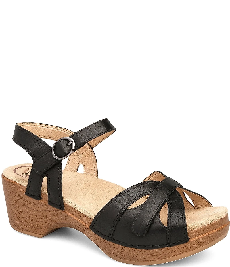 From Dansko, the Season Leather Sandals feature: Leather upper Decorative buckle APMA approved Adjustable hook and loop ankle strap closure Dri-Lex® treated socklining treated with anti-microbial for moisture management and odor control Shock-absorbing foam footbed PU outsole with beveled heel provides durability EVA insert and lightweight nylon shaft for added stability Approx. 2.4" heel height Imported.