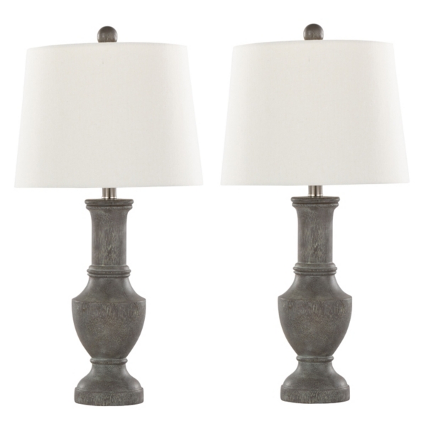 Featuring a mix of modern and classic styles, these Dark Gray Chateau Table Lamps beautifully update your home. Their neutral finish is perfect for modern farmhouse decor! Set includes two (2) table lamps Each lamp measures 26.25H in. Crafted of polyresin and metal Gray wood-like finish Urn shaped base Hardback tapered drum shade in white linen fabric Shade measures 9.5H x 13 in. in diameter Socket accommodates a 100-watt bulb Rocker switch Features a plug-in cord Care: Dust with a soft, dry cloth. Do not exceed specified wattage. This item is available at Kirklands.com only, not available in stores. Please note: this item cannot be shipped to APO/FPO addresses.