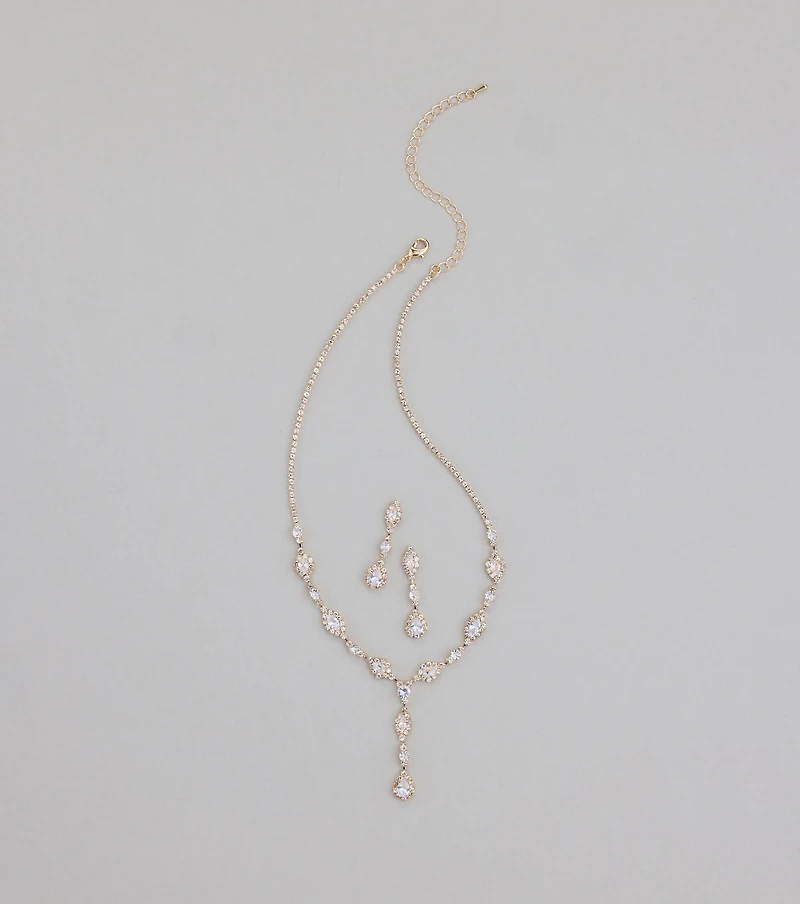 This elegant necklace and earrings set features sparkling rhinestones that capture and reflect light with brilliance while adding the perfect complement to your formal dress.