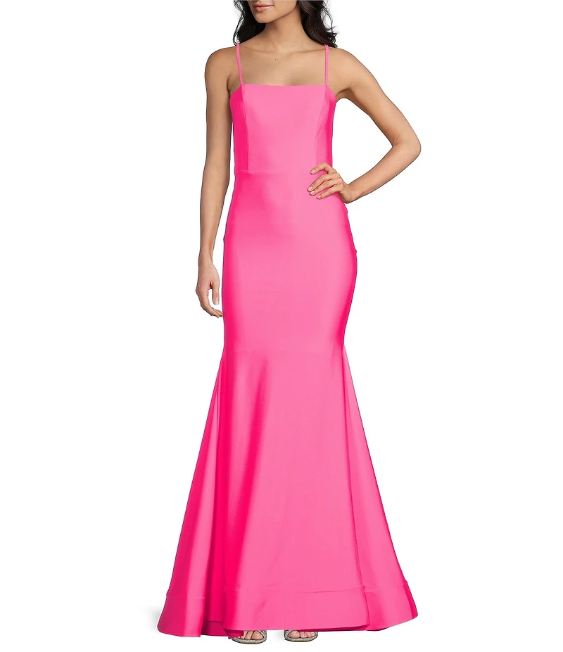 From Dear Moon, this dress features: Square neckline Spaghetti straps Horsehair hem Ruched tie back Zip back closure Approx. 62" length Nylon/spandex; lined Hand wash/line dry Imported.