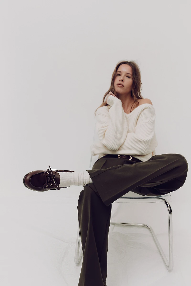 Deck shoes with lacing at top and a moccasin seam at front. Lining in cotton twill.