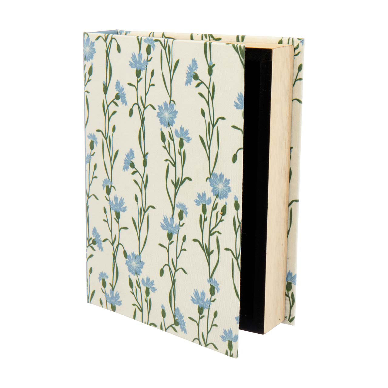Measuring a generous size, this book box is perfect for storing a variety of items, from keepsakes and jewelry to remote controls and small electronics. The exterior features a beautiful floral design with delicate blue flowers and green stems set against a cream background, giving it a timeless and sophisticated look. The spine of the box is adorned with intricate blue detailing, further enhancing its vintage appeal.