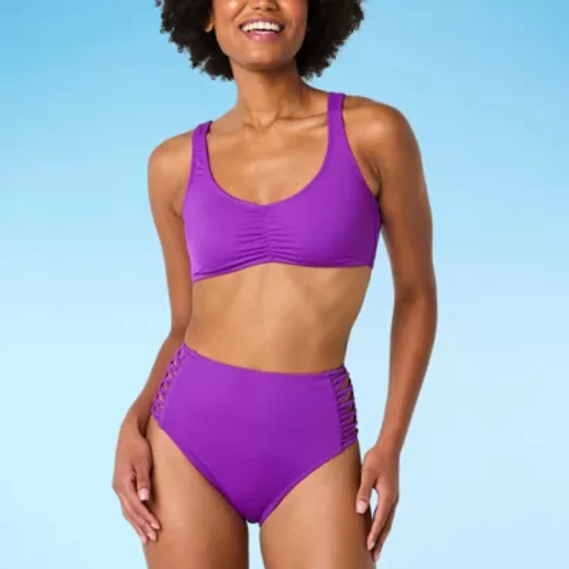 Perfect for mixing and matching with your favorite swim bottoms, this neon women's and junior's bikini bralette by Decree is a versatile piece for your collection. The pullover style is made from a textured stretch-knit and has comfortable straps, a gathered front detail, and removable cups.