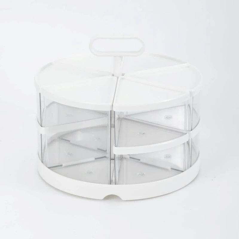 Featuring a 360° rotation on a base with a convenient handle for turning, this turntable organizer is a unique and faceted storage solution. The turntable features six slots with eight small compartments that stack and two large compartments. You can store craft, office and school supplies in this turntable organizer and keep it on a shelf or desktop.Details:Clear and white9.9" x 9.9" x 6.9" (25cm x 25cm x 17.5cm) overall size8 small and 2 large compartments360° rotationSecure storageIdeal for organizing craft and DIY supplies or office essentialsPolypropylene and PET plastic