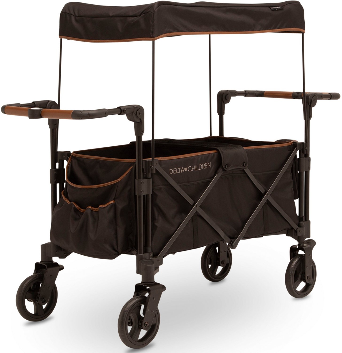 Bring your children with you to the park, store and more in the Delta Children Hercules Stroller Wagon. The weather-resistant fabric, pull down shades and removable canopy all help protect your children and stroller from the sun, rain and other elements, and the steel frame is rust-resistant to promote durability. An expandable bag and multiple pockets safely carry your wallet, keys and more, and the compact foldable design lets you easily take down the stroller and carry it to your car.
