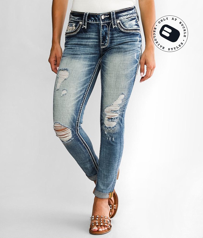 Low rise Slim through the hip and thigh 9 1/2" bottom opening Embroidered faux flap blowout back pockets Destruction details Styled with a cuff Shoe sku 964868 Model Info: Height: 5'6" | Bust: 33" | Waist: 26" | Hip: 38 1/2" | Wearing Size: 24x27