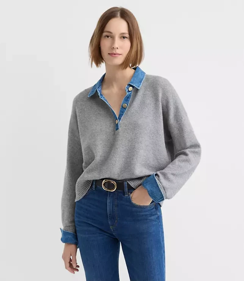 Finished with shimmery metallic buttons, a soft cotton blend knit meets denim trim for irresistibly modern polish. Point collar Long sleeves with button cuffs. Henley button placket., Bullet1: Sweater weight Midweight, Hit: Hits at waist, Imported:, Length: 21 1/2"long, Fabrication: 55% Cotton 22 Polyester 19 Acrylic 4 Spandex, Garment Care: Machine Washable Loft Denim Trim Henley Sweater Size XS Cinder Grey Heather Women's by Loft Size Regular - XS Cinder Grey Heather Women's Cotton, Blend Collared Long Sleeve Pullover Sweaters Casual 55% Cotton 22% Polyester 19% Acrylic 4% Spandex Machine Washable Best Fall Sweaters