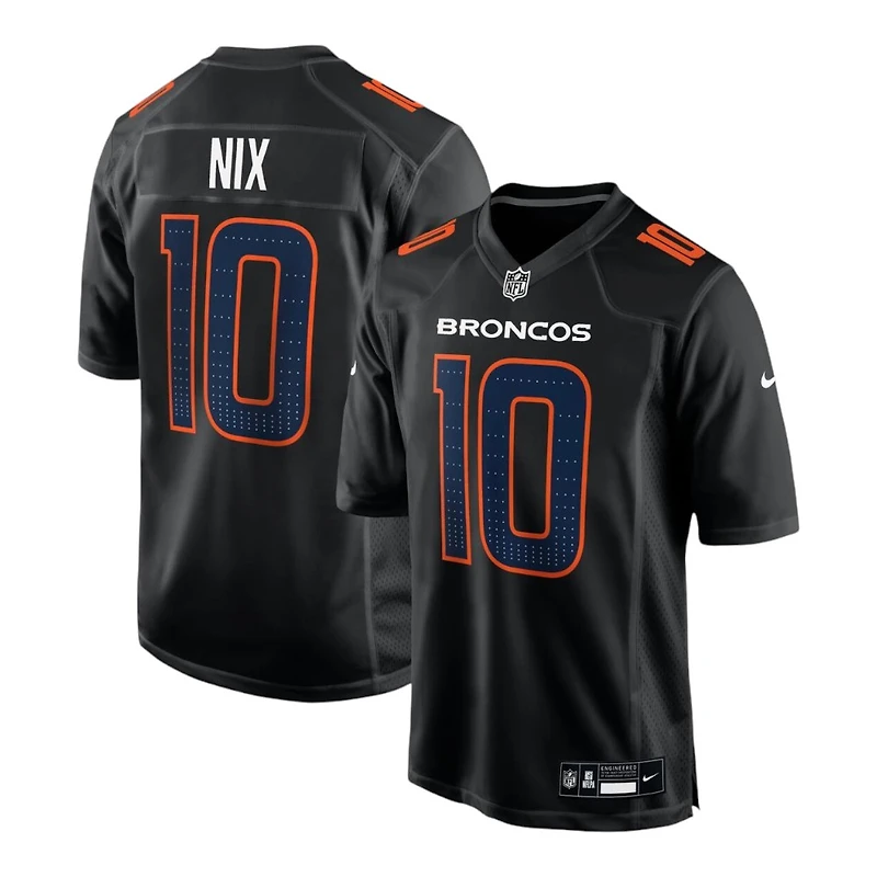 This Denver Broncos Bo Nix Nike Carbon Black Fashion Game Jersey helps you represent your favorite team and player. Nike Game jerseys are designed for total comfort. Wear it at the stadium or in the living room on game day, either way you'll feel confident in the way you're showing pride. It has screen printed name, numbers and logos. The material is 100% polyster with a tailored design for movement. The mesh side panels provide extra breathability.