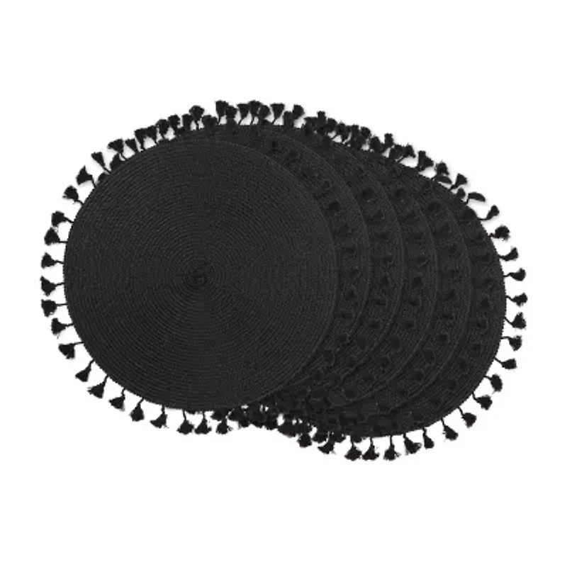 Size: BLACK TASSEL FRINGE WOVN ROUND PLCMT 6PC